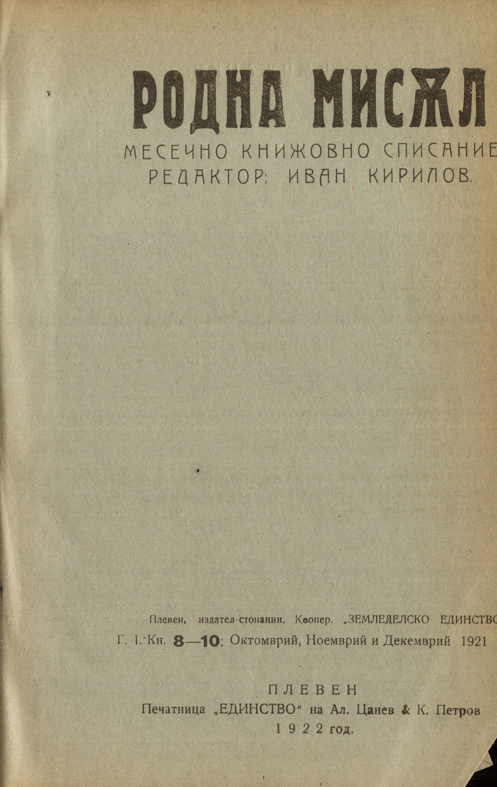 Родна мисъл / Месечно книжовно списание / 1921 кн.8-10